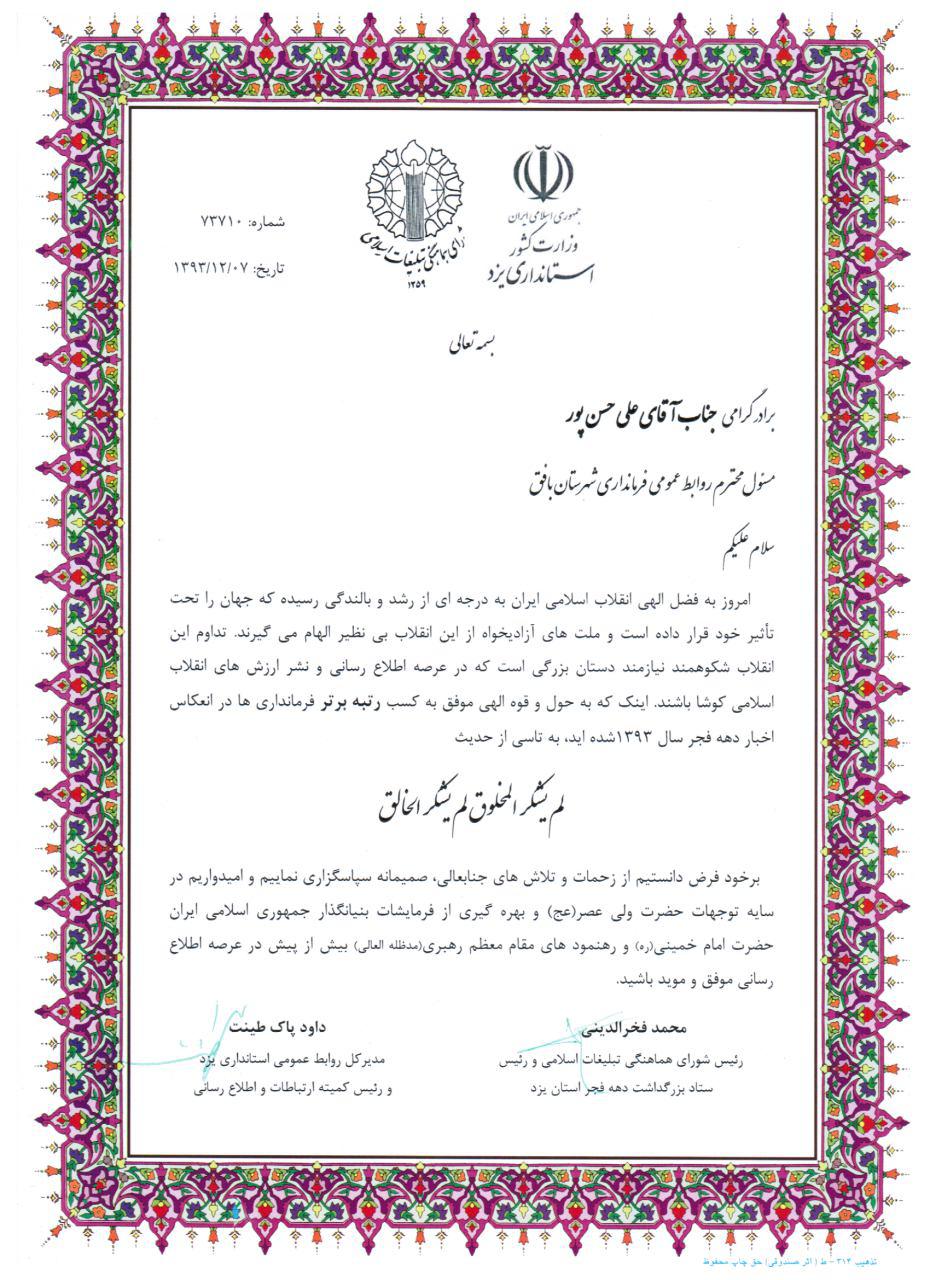 روابط عمومی فرمانداری بافق رتبه برتر در انعکاس برنامه های دهه مبارك فجر سال 93 در بين فرمانداري هاي شهرستان هاي استان يزد را کسب کرد.