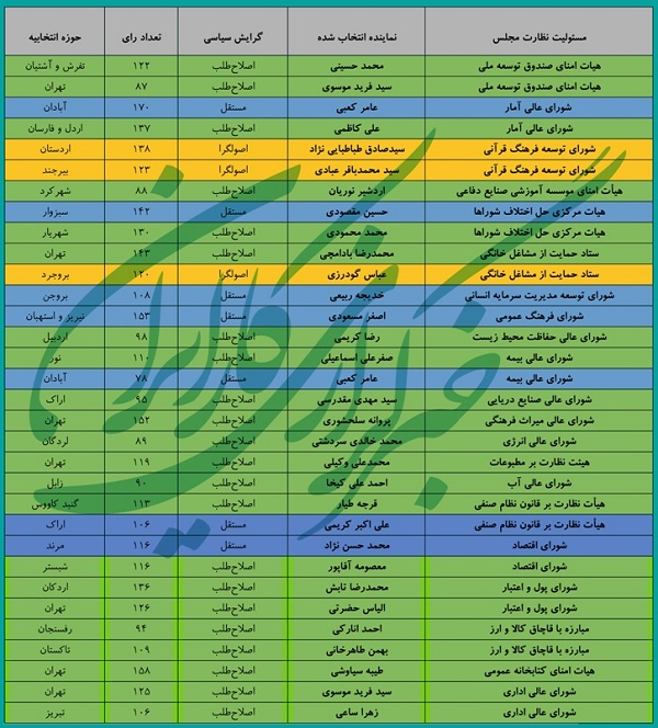 عباس گودرزی از بروجرد در ستاد حمایت از مشاغل خانگی عضو شد و طباطبایینژاد و عبادی نیز در شورای توسعه فرهنگ قرآنی عضو شدند. اما چهرههای شاخص اصلاحطلب تعداد بیشتر و موثرتری در تظارتها دارند. از سیدفرید موسوی که در دو نهاد ناظر شد تا طیبه سیاوشی و پروانه سلحشوری که از زنان فعال لیست امید بودند و تابش و حضرتی که از اعضای شکل دهنده فراکسیون امید بودند و البته اصلاح طلبانی از اردبیل و اراک و شهرکرد و تبریز.