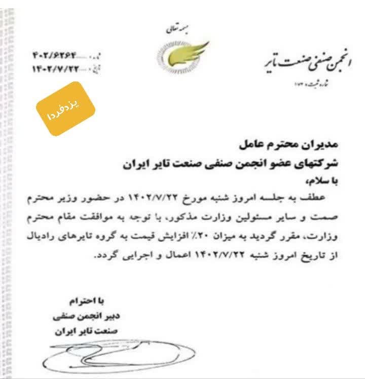 براساس این اطلاعیه که بدست یزدفردا رسیده آمده است:عطف به جلسه امروز شنبه مورخ ۱۳۰۲/۷/۲۲ در حضور وزیر محترم صمت و سایر مسئولین وزارت مذکور، با توجه به موافقت مقام محترم ،وزارت مقرر گردید به میزان ۲۰٪ افزایش قیمت به گروه تایرهای رادیال از تاریخ امروز شنبه ۱۴۰۲/۷/۲۲ اعمال و اجرایی گردد.