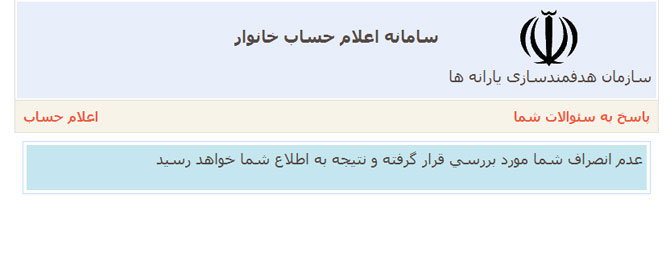 نکته جالب توجه اینجاست که اگر کسی که پیامک دریافت کرده به سایت رفاهی برود و عدم انصراف را انتخاب نماید ، در پایان با این پیام مواجه می شود " عدم انصراف شما مورد بررسی قرار گرفته و نتیجه به اطلاع شما خواهد رسید."