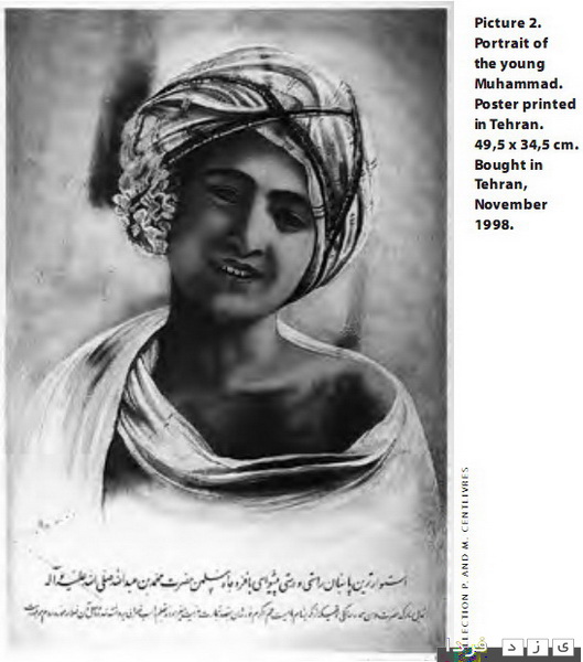 شیعیان ایران سابقه دیرینه ای در به تصویر کشیدن اعضای خاندان حضرت محمد(ص) و خود ایشان دارند. از اواخر دهه نود، پوسترهای پرفروشی منقش به تصویر حضرت محمد(ص) در ایران چاپ شده است که در آنها حضرت محمد به صورت جوانی خوشچهره تصویر گردیده است. این پوسترها امروزه با استفاده از فناوریهای روز و ابزارها و تکنیکهای مختلف تولید میگردند. با وجود این، ساختار تصاویر هنوز سنتی هستند، پس زمینه آنها رنگ ساده ای دارد و رنگها به سادگی در کنار یکدیگر قرار گرفته اند. به علاوه، این تصاویر همواره خصوصیات و صفاتی دارند که تمایز آنها را از دیگر عکسها آسان می سازد، به عنوان مثال شمشیر دو لبه حضرت علی(ع).