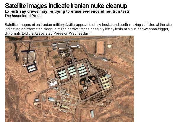 چند تن از دیپلماتها روز چهارشنبه به آسوشیتد پرس گفتند که تصاویر ماهوارهای تاسیسات نظامی ایران ظاهرا کامیونها و خودروهای متحرکی را بر روی این سایت نشان میدهند که حاکی از پاکسازی بقایای رادیواکتیو به جای مانده از انجام آزمایشهای سلاح هستهای میباشد...