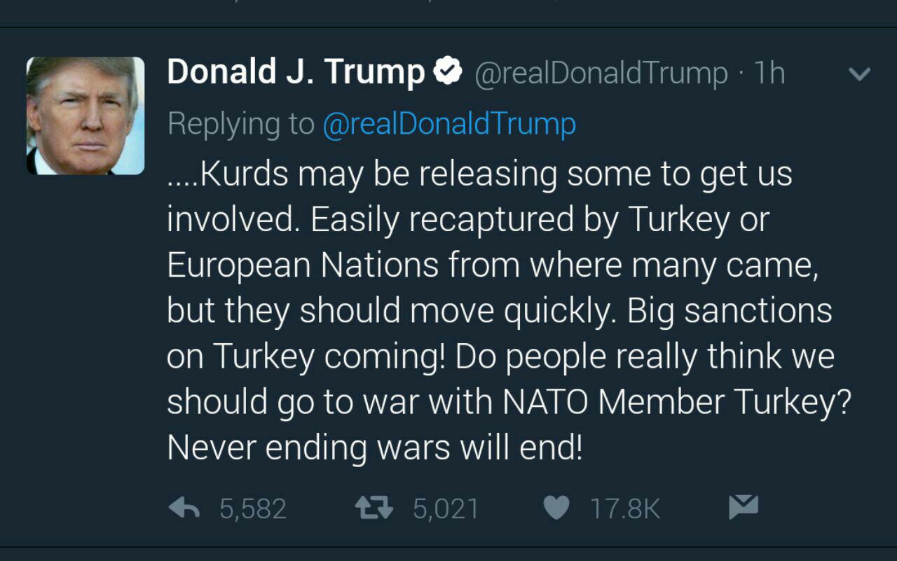 دونالد ترامپ، رئیس جمهور آمریکا : ممکن است برخی از کُردها (ی.پ.گ/پ.ک.ک) برای اینکه ما را وارد ماجرا کنند ( اعضای داعش) را آزاد کرده باشند.