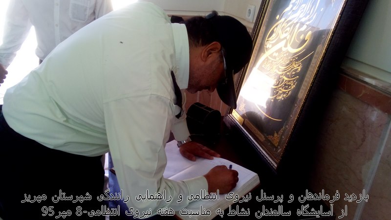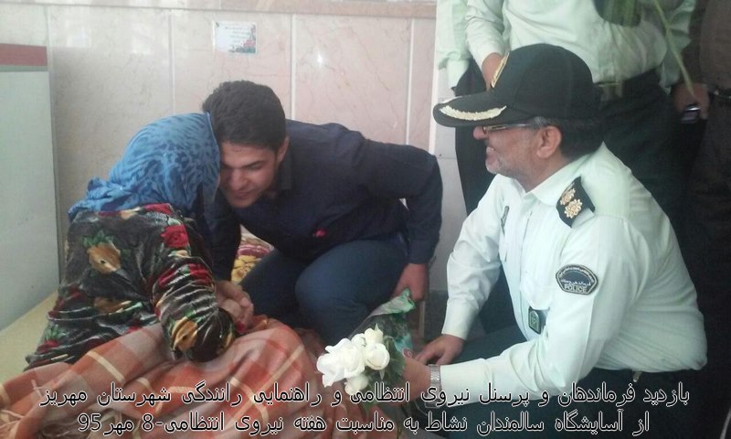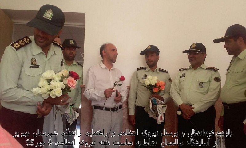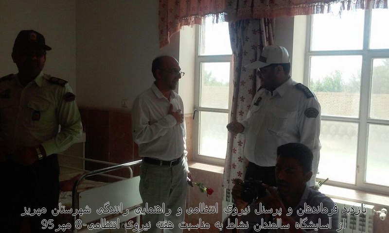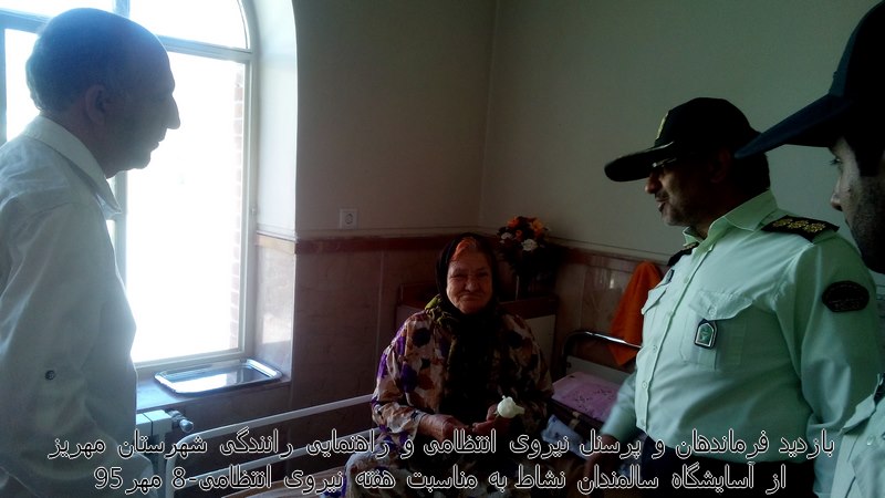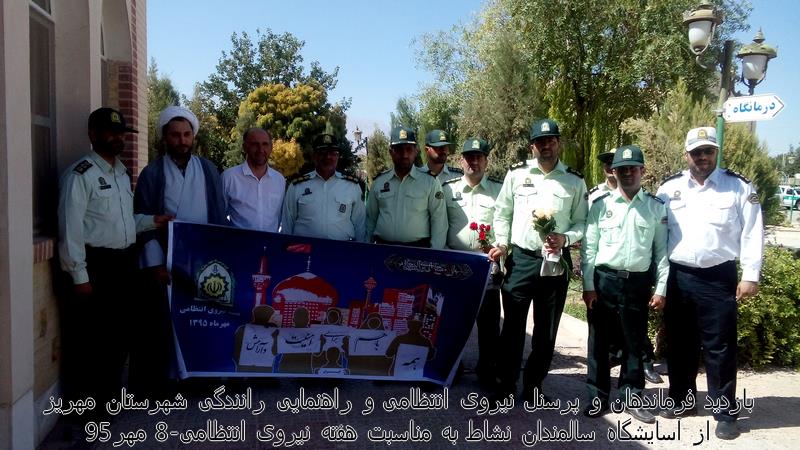 فرماندهان و جمعی از پرسنل نیروی انتظامی و راهنمایی رانندگی شهرستان مهریز ضمن بازدید از خانه سالمندان واهداء گل و شیرینی به سالمندان از این عزیزان عیادت نمودند.