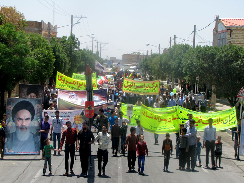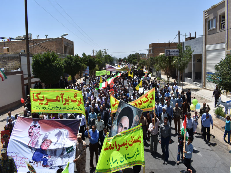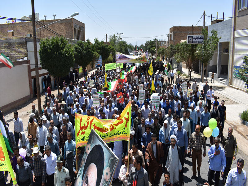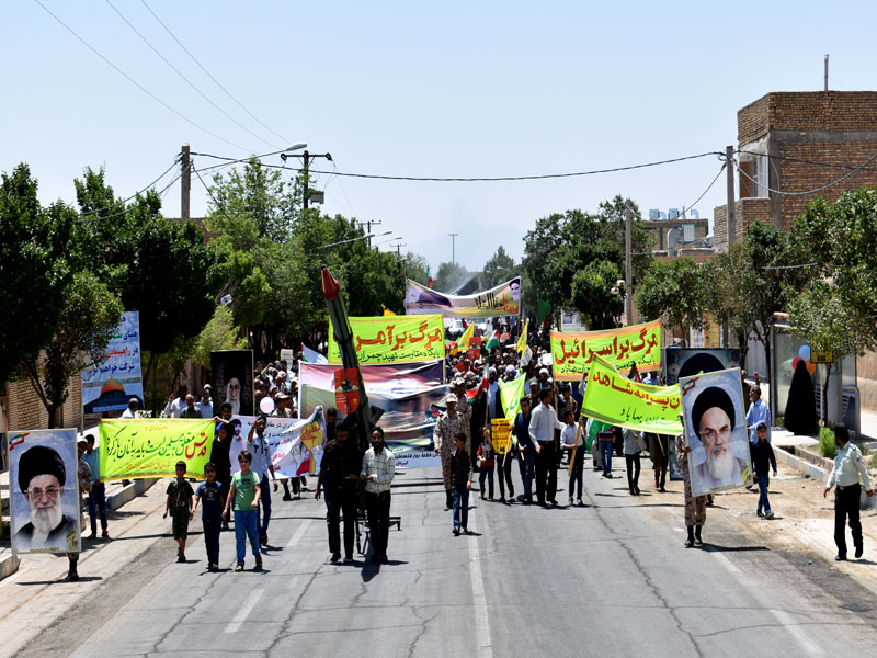 در این راهپیمایی در حالی که پیشاپیش آ نها امام جمعه ، فرماندار روحانیون و اقشار مختلف مردم روزهدار به ویژه خانوادههای معظم شهدا، جانبازان و ایثارگران، دانشآموزان، دانشجویان، بسیجیان، نظامیان و قشرهای مختلف مردم حضور داشتند و در حالی که پلاکاردهایی با مضمون «مرگ بر آمریکا»، «مرگ بر اسرائیل» در دست دارند، انزجار خود را از مستکبران جهان اعلام میکنند.