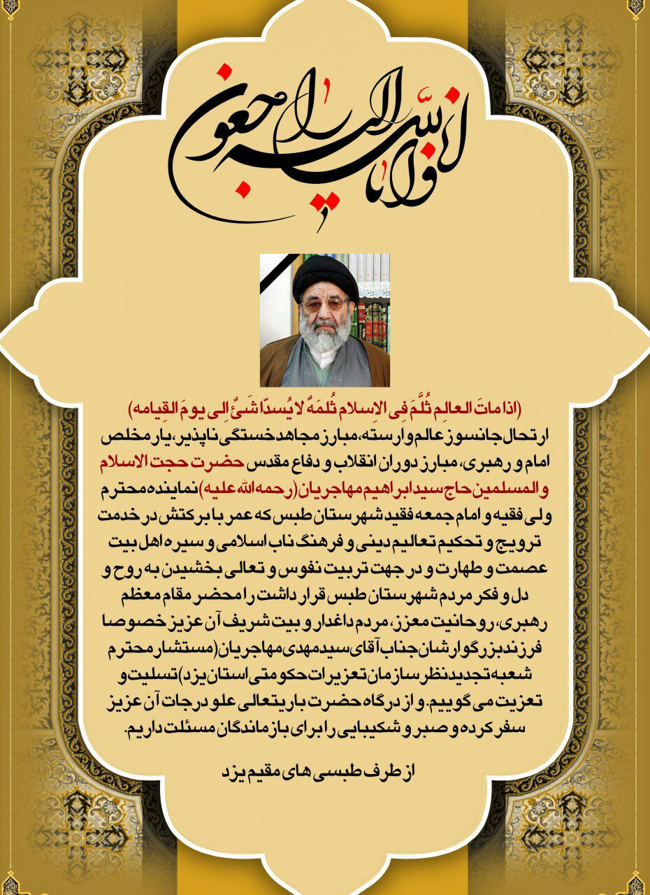 يزد فردا : طبسيهاي مقيم يزد در پيامي درگذشت امام جمعه فقيد طبس سيد ابراهيم مهاجريان مقدم را به بيت آن مرحوم بويژه سيد مهدي مهاجريان مقدم مستشار شعبه تجديدنظر تعزيرات حكومتي استان يزد تسليت و تعزيت گفته از خداوند باريتعالي براي ان مرحوم علو درجات و براي بازماندگان صبر و شكيبايي مسئلت داشتند.