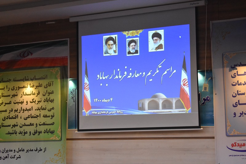 درآئینی که روزگذشته با حضورمعاون سیاسی امنیتی استاندار ، مدیرکل سیاسی امنیتی استانداریزد ومشاورین استاندار ، مدیران معادن وشرکتهای اطراف ، مسئولان ادارات ونهادها ، فرماندهان نظامی وانتظامی ، امام جمعه ، شهردارورئیس واعضای شورای اسلامی شهر اقشار مردم وخانواده های شهدا درسالن دانشگاه آزاداسلامی واحد بهاباد برگزارشد . علیرضا تیموری به عنوان سرپرست جدید فرمانداری بهاباد معرفی شد و ازخدمات وتلاشهای مهندس محمد مهدی خانی زاده بهابادی که درطول این 4 سال برای شهرستان بهابادتلاش وزحمت کشیدند قدردانی به عمل آمد .