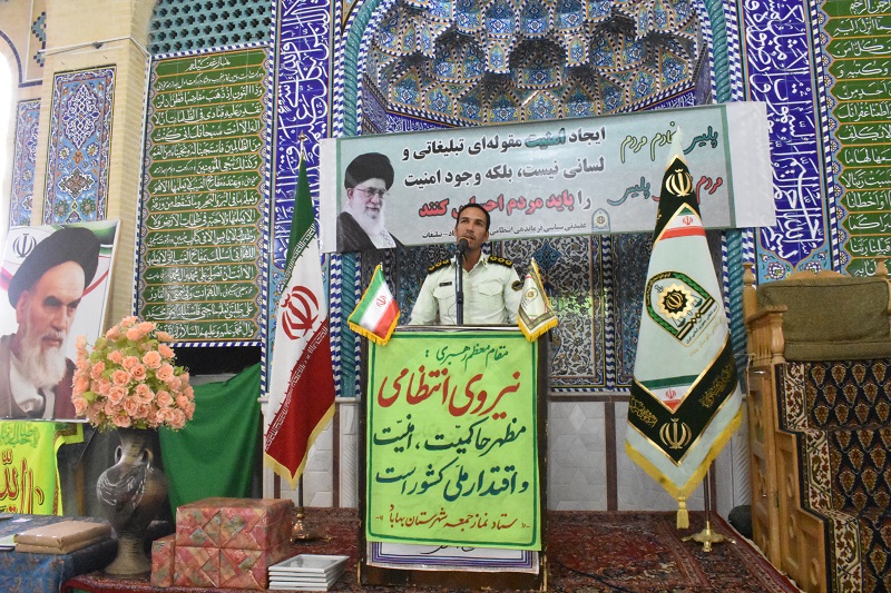 همچنین در نمازجمعه این هفته سرگرد عباسی فرمانده انتظامی شهرستان بهاباد درسخنانی ضمن تبریک هفته نیروی انتظامی به گزارش عملکردیک ساله نیروی انتظامی شهرستان پرداخت ودرپایان با اهدای شاخه گل توسط مسئولین به فرمانده و پرسنل خدوم ناجای بهاباد از زحمات انان تجلیل شد.