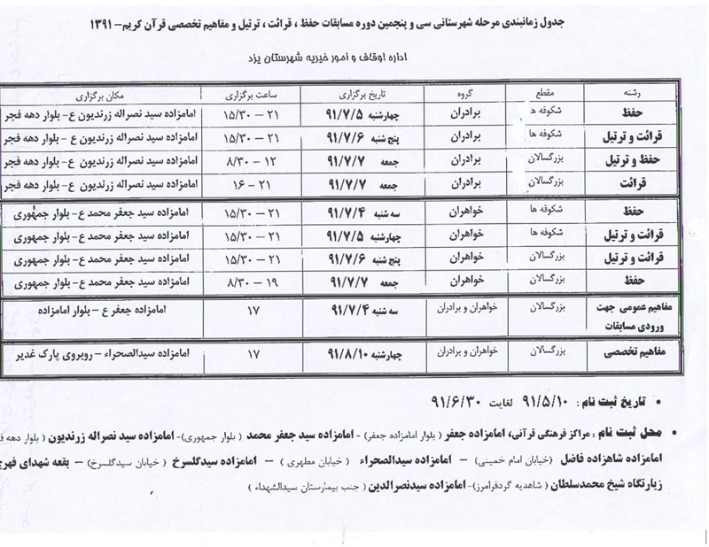 گفتنی است مهلت ثبت نام تا تاریخ 30 شهریور در مراکز فرهنگی قرآنی امامزاده جعفر، سید جعفر محمد، سید نصر الله، شاهزاده فاضل، سید الصحرا، سید گلسرخ، بقعه شهدای فهرج، زیارتگاه شیخ محمد سلطان و سید نصر الدین علیهم السلام می باشد.