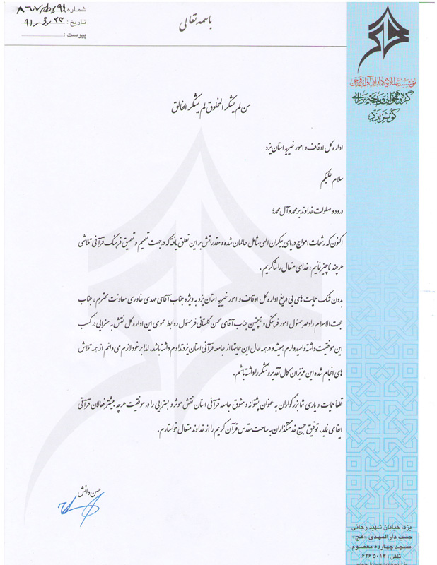 در بخشی از این تقدیر نامه آمده است : قطعا حمایت و یاری شما بزرگواران به عنوان پشتوانه و مشوق جامعه قرآنی استان نقش موثر و بسزایی را در موفقیت هرچه بیشتر فعالان قرآنی ایفا می نماید.