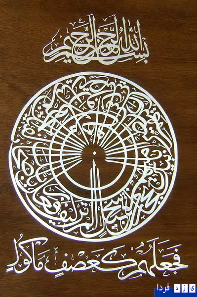 ملکزاده در گفتگو با خبرنگار ما، در این زمینه گفت: این تابلو سوره مبارکه فیل است که به صورت مشبک کار شده اما تفاوت آن در این است که به جای چوب از آلومینیم استفاده کرده ام.