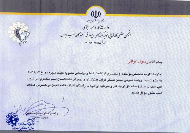 در حکم کیومرث عظیمی برای رسول عراقی آمده است: نظر به تخصص، توانمندی و تجارب ارزشمند شما و بر اساس مصوبه هیئت مدیره به عنوان مدیر روابط عمومی منصوب می شوید، امید است در سال "تولید ملی، حمایت از کار و سرمایه ایرانی" در راستای اهداف عالیه انجمن در گسترش صنعت اسب کشور موفق باشید.