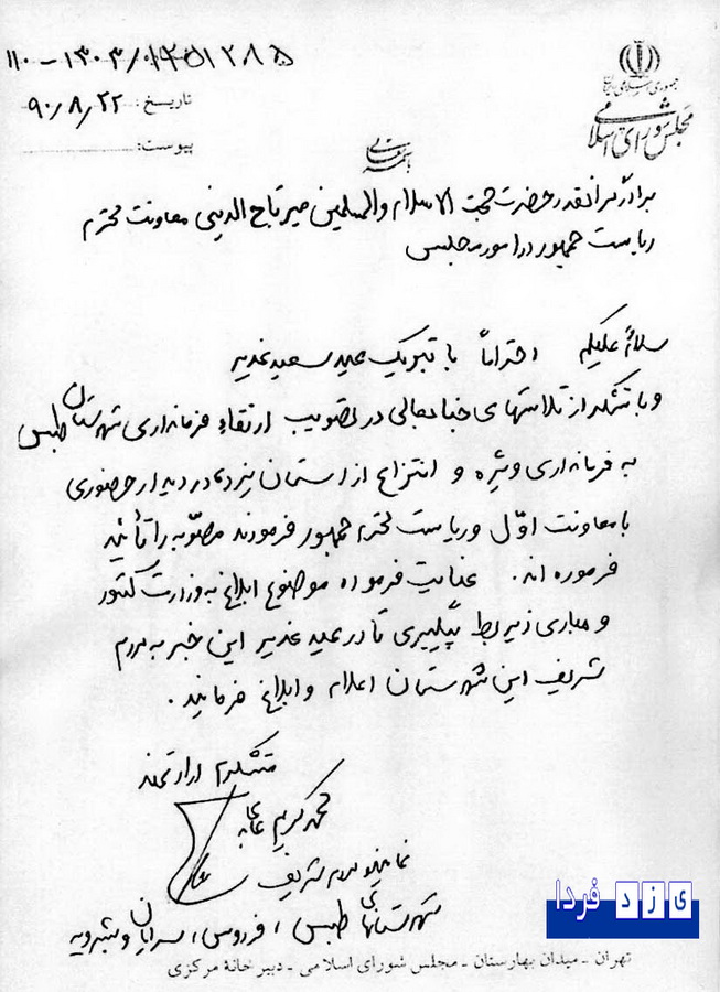 یکی از مدارکی که ثابت می کند علت اصلی تصمیم امروز دولت چیست، نامه ای است که نماینده سابق مردم شریف طبس به معاون پارلمانی ریاست جمهوری در دقایق نمود نوشته است و خواستار انتزاع طبس از یزد شده بود.