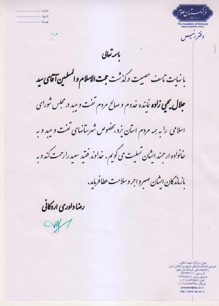 پیام تسلیت  دکتر رضا داوری اردکانی رئیس فرهنگستان علوم جمهوری اسلامی ایران به مناسبت درگذشت حضرت حجت الاسلام و المسلمین یحیی زاده