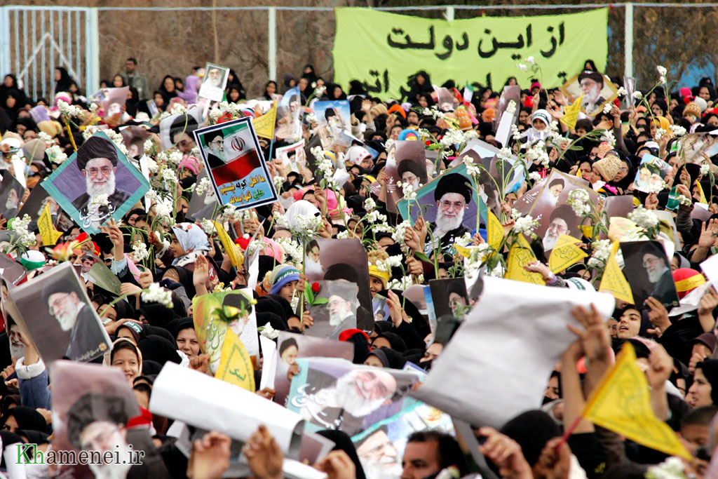 اين كشور به ناحق عقب مانده نگه داشته شد. ما امروز پيشرفتهاى زيادى كرديم، اما اين پيشرفتها نسبت به آنچه كه شأن ملت ايران است و جايگاه ملت ايران است، كم است. ملت ايران يك روزى در قله ى علم و اقتدار مادى و معنوى قرار داشته است به بركت اسلام. ما امروز اسلام را بازيابى كرده ايم؛ آغوشمان را به روى اسلام باز كرديم، اسلام را با نگاه متناسب با زمانه و با پيشرفت زمانه به دنيا عرضه كرديم. امروز تفكر سياسىِ اسلامى، تفكر اجتماعى اسلام، تفكر گرايش معنوى اسلام، تفكر اسلام در مورد روابط داخلى و درونى افراد جامعه با هم، ميتواند در دنيا مثل يك دستورالعمل، مثل يك سرمشق مطرح شود؛ نه اينكه اين حرف را ما بزنيم يا من اينجا بگويم؛ اين سخنى است كه امروز انديشمندان باانصاف دنيا همين حرف را ميزنند. اين را ملت ايران آسان هم به دست نياورده. شما شهيد داديد؛ ابركوه شهداى عزيزى دارد، فداكارانى دارد، پدر مادرهائى دارد كه فرزندان خودشان را فرستادند براى دفاع از اين انقلاب در دوران جوشش انقلاب؛ و براى دفاع از مرزهاى كشور در دوران دفاع مقدس. اينها بوده است كه توانسته اين انقلاب را زنده نگه دارد، اين پرچم را بلند نگه دارد و امروز ملت ايران را عزيز كند.