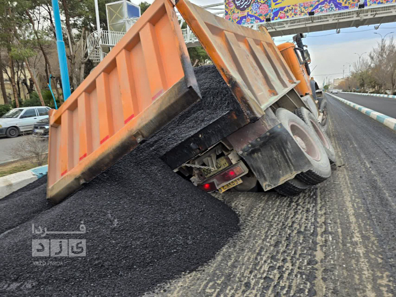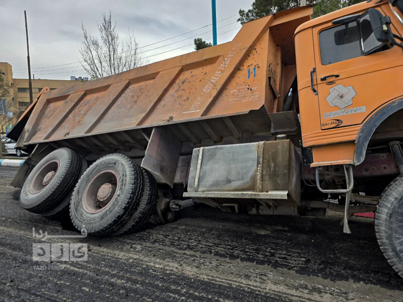 کامیون آسفالتی که در خیابان مطهری یزد در حال تردد بود در زمین فرو رفت.