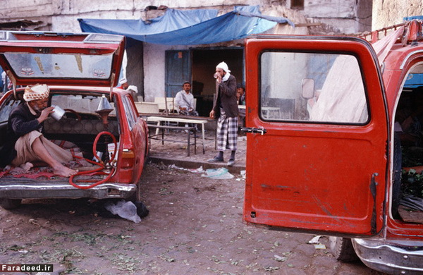 مقطع مهم بین سال های 1990 تا 1994 زمانی است که یمن به ریاست علی عبدالله صالح پس از سالها جنگ داخلی و نیز مبارزه با استعمار انگلیس به عنوان یک کشور واحد لحظات مهمی از تاریخ خود را سپری میکند. "نیکوس اکولومپوس" عکاس یونانی درست در همین زمان یعنی در سال 1992 چند هفتهای را به یمن سفر میکند و از این کشور تازه شکل گرفته عکاسی میکند. او در سفر خود به صنعا بیشتر به زندگی مردم کوچه و بازار توجه دارد و از این جهت عکسهایش قابل توجهی از این کشور در 23 سال پیش یمن به دست میدهد. یکی از سوژه های عکاس در مجموعه عکس هایش عکاسی از کشت و خرید و فروش گیاه مخدر "قات" در یمن است. توجه به پوشش مردم، و معماری شهرها و نمای ساختمانها دیگر سوژه های مورد توجه این عکاس بوده است.