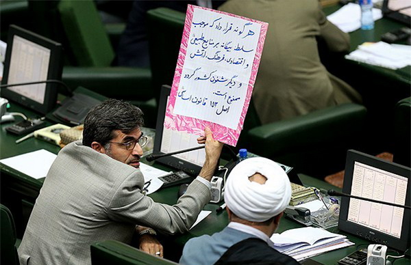 مهدی کوچکزاده، نماینده تهران در این پلاکارد که به نشانه اعتراض بالای سر خود گرفته بود نوشته بود: هرگونه قراردادی که موجب سلطه بیگانه بر منابع طبیعی، اقتصادی و فرهنگی و ارتش و دیگر شئون کشور گردد ممنوع است. عکس های روح الله وحدتی عکاس ایسنا، سید محمود حسینی عکاس تسنیم، امید وهاب زاده عکاس فارس و مجتبی محمدلو عکاس ایرنا از حواشی جلسه امروز را در زیر می بینید.
