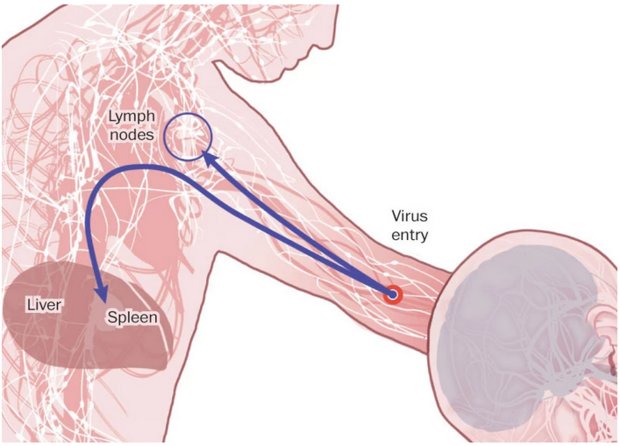 سلول های ایمنی آلوده از طریق جریان خون یا مجراهای لنفی به دیگر بافت ها و اندام ها، به خارج از طحال و گره های لنفاوی، انتقال می یابند.