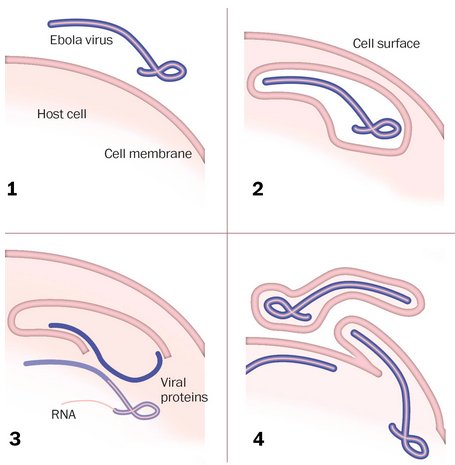 ۳. نحوه خروج از سلول به طور کامل درک و شناخته نشده است، اما به نظر می رسد که ذرات ویروس در سطح سلول جمع شده و بیرون می آیند و ممکن است با یک پاکت میزبان خارج شوند.