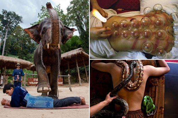 پایگاه خبری یزدفردا"(تصاویر) عجیبترین روشهای درمانی/یک فیل سه تنی با استفاده از خرطوم و پای خود، توریستها را ماساژ میدهد، اما این عجیبترین نوع روش درمانی نیست.