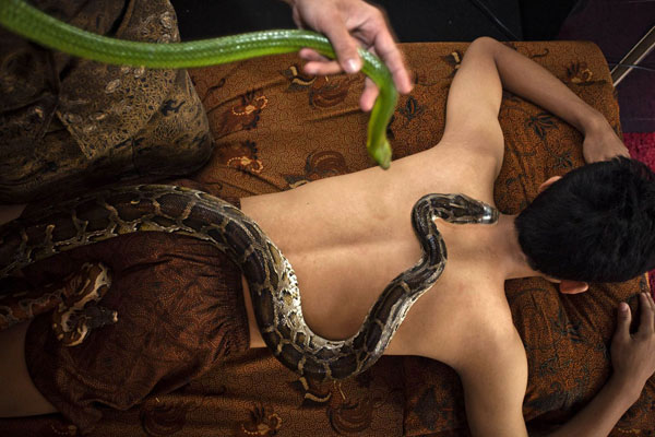 در باغوحش سِبو سیتی در فیلیپین، نوعی روش ابتکاری ماساژ با مارها به مشتریان ارائه میشود که در آن چهار مار پنج متری به مدت 15 دقیقه بر روی بدن مشتری حرکت میکنند و هر کدام با وزن 250 کیلوگرمی خود ماساژی فراموشنشدنی را برای مشتری به ارمغان میآورند.