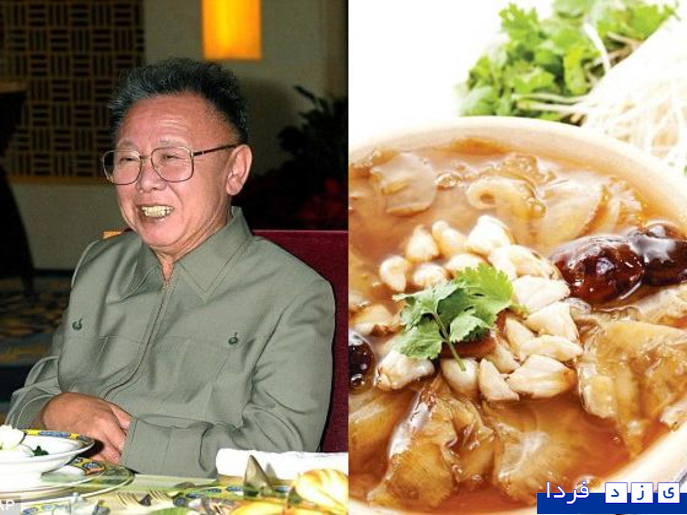 دیکتاتور کره شمالی مهمانی های مجلل می گرفت. او به سوپ باله کوسه خیلی علاقه داشت، ولی به دلیل ممنوعیت صید این ماهی، این کتاب آشپزی استفاده از سینه مرغ را به جای باله کوسه توصیه می کند.