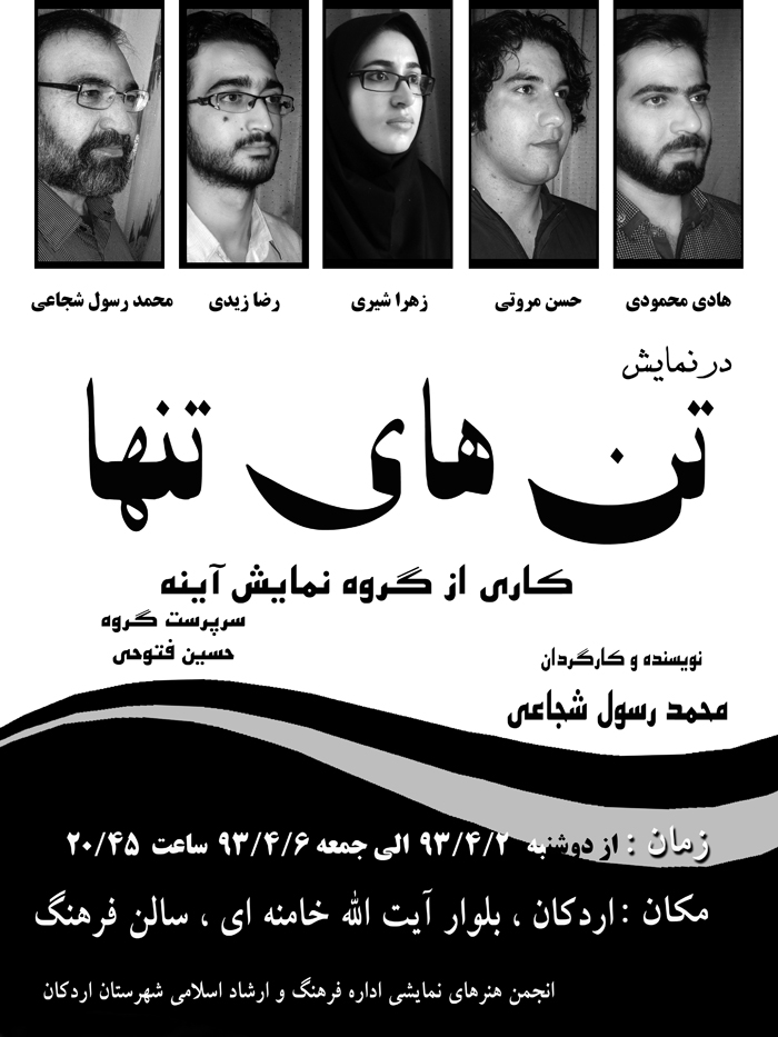 نمایش تن های تنها تا جمعه ۱۳۹۳/۴/۶ ساعت ۲۰:۴۵ در تالار فرهنگ واقع در بلوار آیت الله خامنه ای اردکان به روی صحنه است .