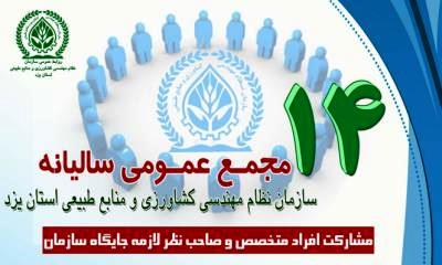 چهاردهمين مجمع عمومي ساليانه سازمان از ساعت 9:00 تا 11:30 صبح روز چهارشنبه 7 مردادماه 94 در محل سالن شهيد منتظر قائم دانشكده منابع طبيعي دانشگاه يزد واقع در : صفائيه- بلوار شهيدان اشرف- بعد از مجتمع آموزشي ملاصدرا- ورودي بصيرت؛ برگزار مي گردد .