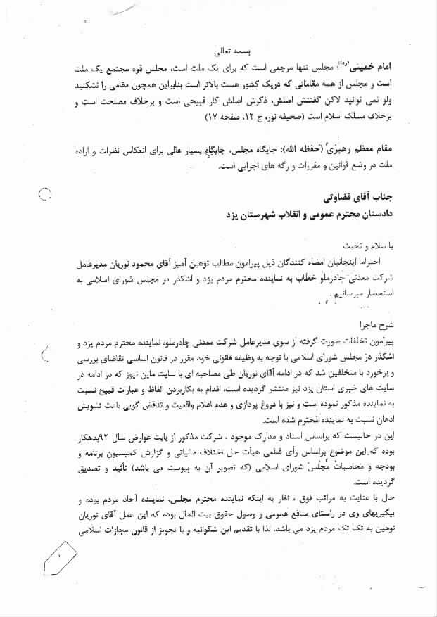پیرامون تخلفات صورت گرفته از سوی مدیرعامل شرکت معدنی چادرملو، نماینده محترم مردم یزد و اشکذر در مجلس شورای اسلامی با توجه به وظیفه قانونی خود مقرر در قانون اساسی تقاضای بررسی و برخورد با متخلفین شد که در ادامه آقای نوریان طی مصاحبه ای با سایت ماین نیوز که در ادامه در سایت های خبری استان یزد نیز منتشر گردیده است، اقدام به بکاربردن الفاظ و عبارات قبیح نسبت به نماینده مذکور نموده است و نیز با دروغ پردازی و عدم اعلام واقعیت و تناقض گویی باعث تشویش اذهان نسبت به نماینده محترم شده است.