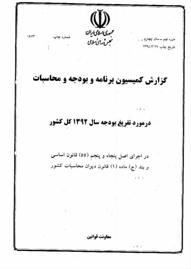3- تصویر گزارش کمیسیون برنامه و بودجه محاسبات مجلس شورای اسلامی در مورد تفریغ بودجه 92