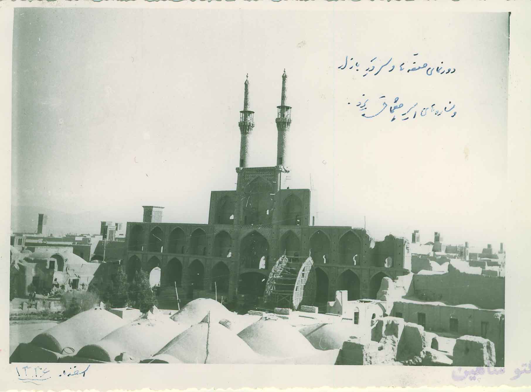 وی در توضیح عکس اول گفت: این عکس این بنا را در سال ۱۳۳۶ نشان می‌دهد که با دقت در این عکس مشاهده می‌شود ضلع شمالی جنب حمام امیرچخماق در لبه ساختمان تکیه، جداره‌ای نبوده و اگر جداره‌ای وجود داشته در قسمت دیگری بوده است که باید با مطالعات دقیق نسبت به اجرای آن تصمیم‌گیری می‌شد.