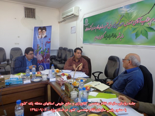 یزدفردا:جلسه رؤسای سازمان نظام مهندسی کشاورزی و منابع طبیعی استانهای منطقه یک کشور در استان یزد با حضور آقای مهندس کبیری ریاست محترم سازمان نظام مهندسی کشور، آقای مهندس حقیقی معاون محترم اداری و مالی سازمان نظام مهندسی کشور ، رؤسا و معاونین اشتغال سازمان نظام مهندسی استانهای منطقه یک کشور در روز دوشنبه 2 آذرماه 94 در سالن اجتماعات ملاصدرا برگزار گردید.