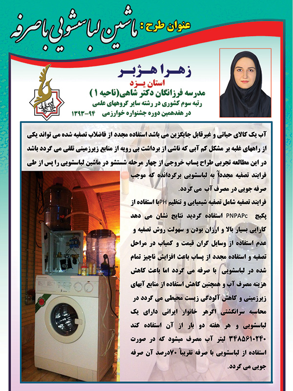 هژبر، دانشآموز دوره پیشدانشگاهی دبیرستان فرزانگان دکتر شاهی استان یزد با شرکت در رشته "مکاترونیک" با ارایه طرح "ماشین لباسشویی با صرفه" در این جشنواره توانست رتبه سوم کشوری را از آن خود کند.