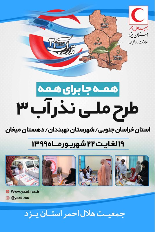 به گزارش روابط عمومی جمعیت هلال احمر استان یزد ؛ دکترمحسن حرازی زاده یزدی مدیرعامل جمعیت هلال احمر استان یزد اظهار داشت: در راستای طرح ملی نذر آب 3 ؛ تیم درمانی جمعیت هلال احمر استان یزد ( با پیوست ویروس کرونا ) متشکل از 20 نفر که شامل 5 نفر پزشک متخصص (داخلی، عفونی، اطفال، زنان و زایمان، ارتوپدی) و پزشک عمومی، روانشناس، پرستار، ماما و نیروهای داوطلب هلال احمر استان به استان خراسان جنوبی اعزام می شوند.
