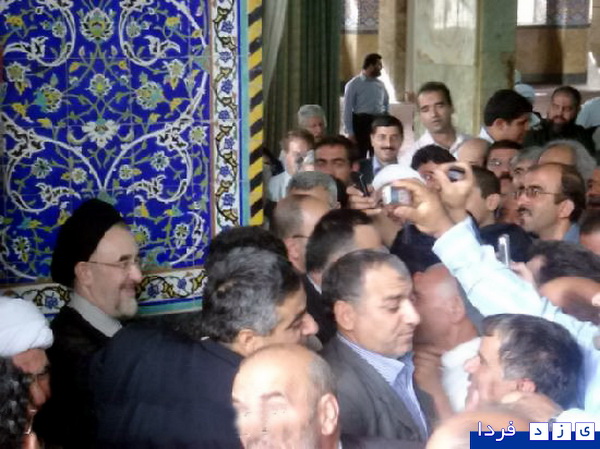 در حالی که خاتمی از پشت سر آنها(کسانی که روی صندلی های درب مسجد برای خوش آمد گویی نشسته بودند)حرکت می کرد آقای فلاح زاده استاندار یزد صندلی خود را به عقب کشید و راه را برای حضور آقای خاتمی باز کرد.