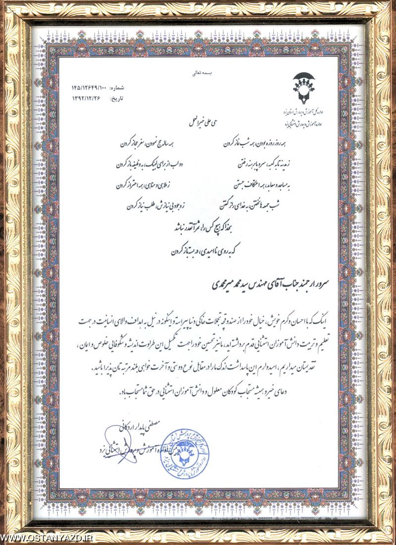 به گزارش روابط عمومي استانداري يزد، در آخرين جلسه شوراي اداري سال جاري در استانداري يزد، "سيد محمد ميرمحمدي" استاندار يزد، تمامي هداياي دريافتي از سازمان ها، نهادها و ارگان هاي دولتي را كه از ابتداي شروع به خدمت خود در استان يزد دريافت كرده بود به كودكان استثنايي استان تقديم كرد.