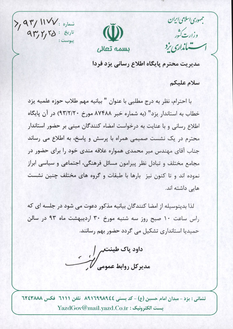 به گزارش يزد فردا "اداره كل روابط عمومي استانداري يزد" با ارسال نامه اي به مدير سايت يزد فردا، اعلام كرد استاندار، رسما از طلاب امضاكننده بيانيه براي برگزاري يك نشست مشترك در روز سه شنبه مورخ 30 ارديبهشت ماه 93 دعوت نموده است.