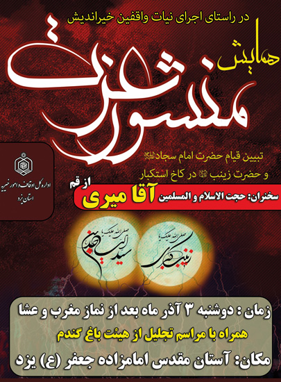 به گزارش روابط عمومی اداره کل اوقاف و امور خیریه استان یزد، حجت الاسلام محمود میرجلیلی با اعلام این خبر افزود: هم زمان با ورود کاروان اهل بیت(ع) به شهر شام در نخستین روز از ماه صفر و خطبهخوانی حضرت سجاد(ع) و عقیله بنی هاشم حضرت زینب کبری(س) در کاخ یزید، "همایش منشور عزت" در «تبیین قیام حضرت امام سجادعلیهالسلام و حضرت زینب سلاماللهعلیها در کاخ استکبار» در امامزاده جعفر (ع) یزد برگزار خواهد شد.