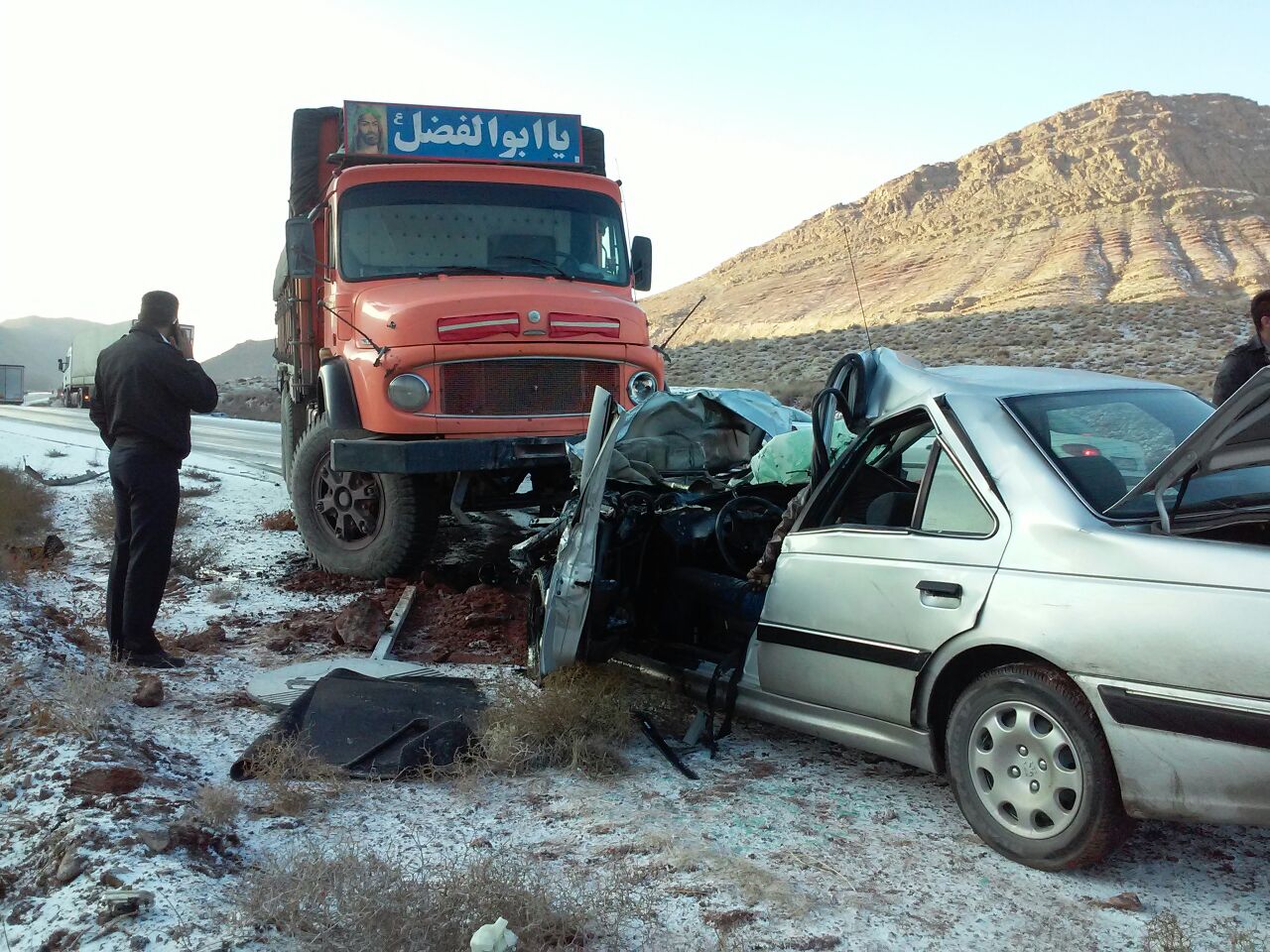 این حادثه به علت یخ زدگی و لغزندگی جاده و سرعت زیاد خودرو که باعث انحراف آن به چپ و برخورد با کامیون شده است .